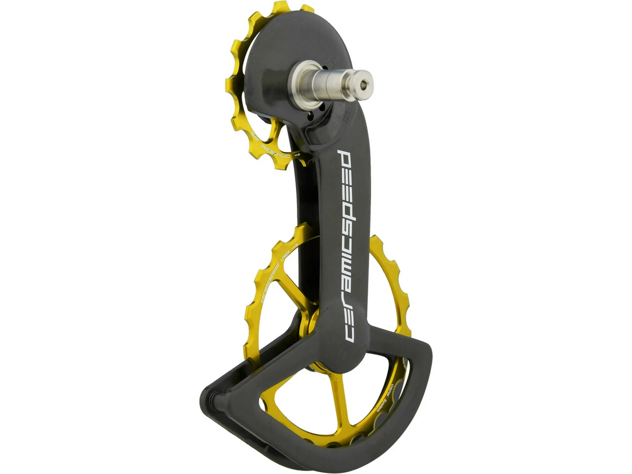 Specifications:Application:Road, Triathlon & Time TrialGearing:12-speedCassette Teeth (max.):34-toothCompatibility:Shimano Dura-Ace Di2 RD-R9250, Ultegra Di2 RD-R8150Technical Information:Derailleur Pulleys:13 tooth (upper derailleur pulley), 19 tooth (lower derailleur pulley)Outer Cage Material:polyamide, carbonInner Cage Material:polyamide, carbonOther Materials:aluminiumBearings:CeramicFeatures:oversize derailleur pulley system with ceramic bearings, offering unique durability and performancereduced friction and increased energy savings for a highly efficient drivetrainhigh-performance bearings with very hard, above-average supple and resilient ceramic balls made of grade-3 silicon nitride (best achievable grade for ceramic bearings)ball bearing races additionally metal-coated for more performance and durabilityintegrated stop bolt for simplified installationfour spring tension optionscompatible with 11-30 and 11-34 12-speed cassetteshandmade in DenmarkTechnology:Ceramic Bearings by CeramicSpeed