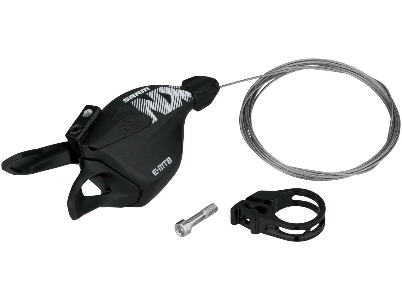 Specifications:Series:SRAM NX EagleApplication:E-MTBGearing:12-speedMount:clamp (closed)Technical Information:Type:triggerBody Material:CompositeLever Material:CompositeFeatures:E-MTB specific with individual gear changes for longer battery life and lower wear of drivetrain componentsEagle™ technology for smoother, more precise gear changesTechnology:X-ACTUATION™